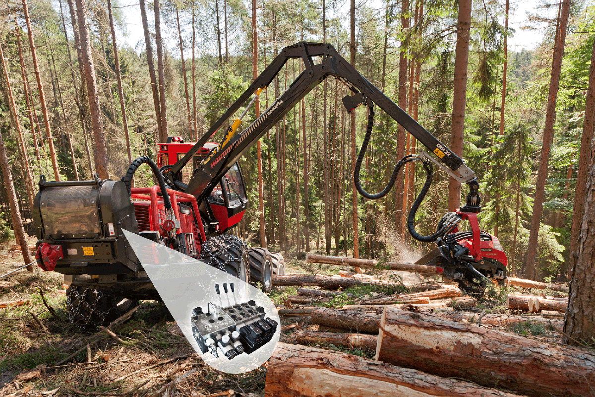 This is a hybrid valve block specially developed for the forestry industry. It consists of a DANFOSS POWER SOLUTIONS PVG32 proportional valve, combined with a COMATROL-HIC block. The subsystem designed by HAINZL combines the main functionality of the proportional control system with the cost effective and space saving design of the cartridge block technique. In addition, the entire system comprises customised HAINZL mobile control which, according to expert opinion, has become one of the most efficient harvester traction winches on the market.